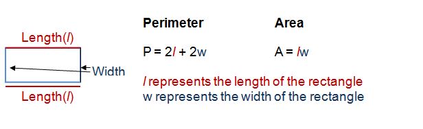 Let's start with 2 formulas that you are very familiar with. The area and perimeter formulas are used quite often in math. You may be familiar with these formulas, but if not take a look at the following diagram.